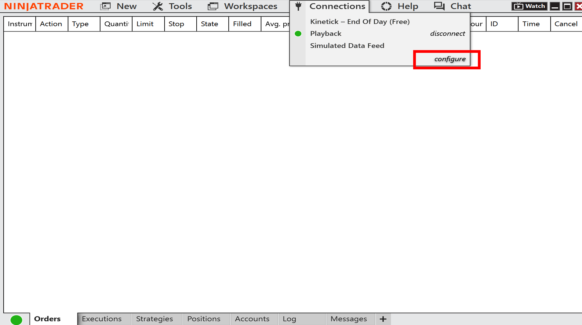 - Click Connections → Configure, then double-click Rithmic for NinjaTrader Brokerage.