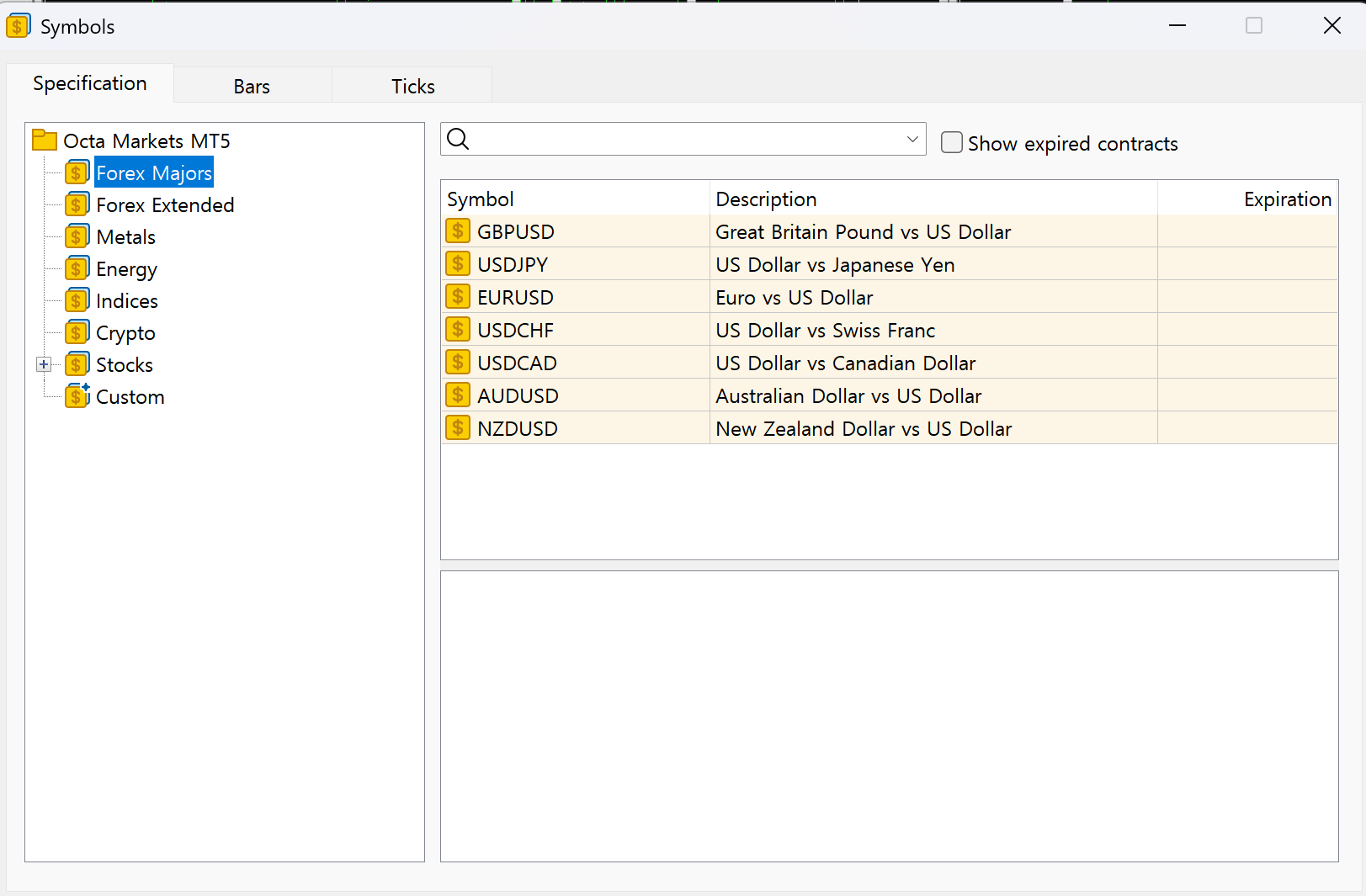 - In the left tree menu, double-click the desired category (like Forex Majors).